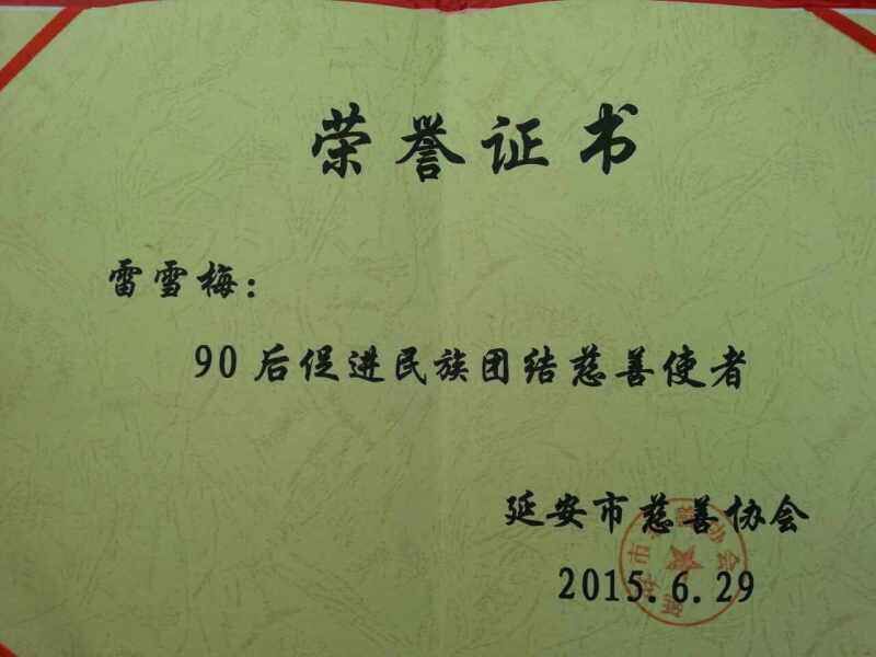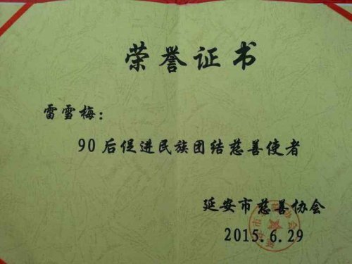 除了参加首映式外,雷雪梅同学还积极加入了范跃宁的爱心团队,为延安宜川中学的一名高二贫困生捐赠了1000元,并与其结成了长期帮扶对子,誓将自己的爱心传递给更多需要帮助的贫困学子。 雷雪梅(中)获“90后促进民族团结慈善使者”称号 撰稿:赵婷婷 |