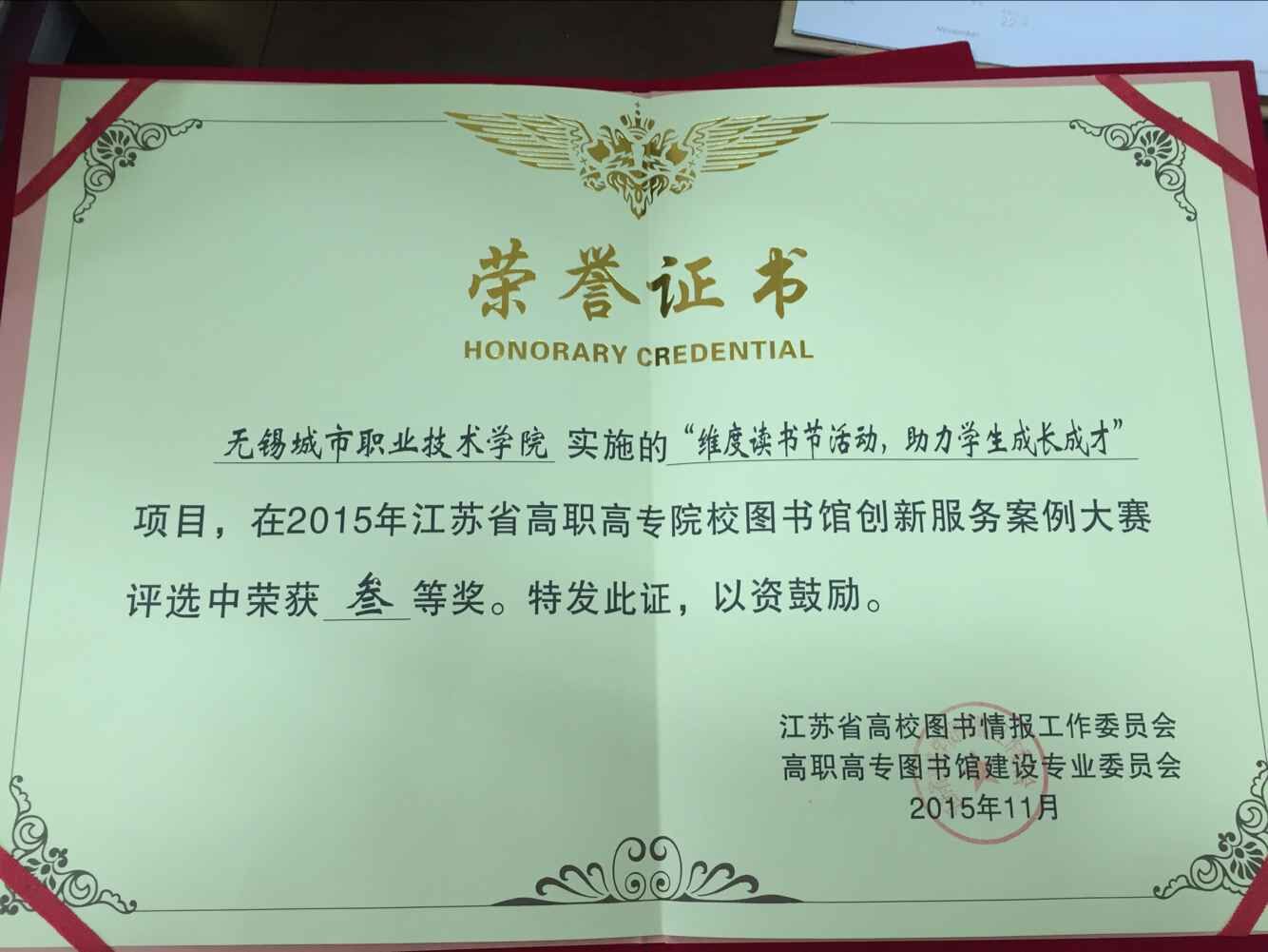 近日,江苏省高校图工委高职高专图书馆专业建设委员会2015年创新服务案例大赛在徐州落幕。我院图书馆申报的《基于“职业系谱”的高职图书馆学科服务》、《多维度读书节活动,助力学生成长成才》等项目在全省32所高职图书馆选送的43个案例中脱颖而出,分获“2015年江苏省高职高专院校图书馆创新服务案例大赛”二、三等奖。