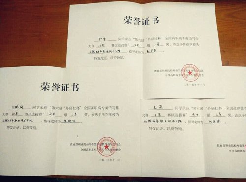第六届“外研社杯”全国高职高专英语写作大赛江苏赛区复赛于11月14日-15日在常州信息职业技术学院举行。本次大赛全省共有68所高职院校参加,共计170名选手参加比赛。其中公共英语组选手127名,英语专业组选手43名。经过激烈的比赛,我院会计1301邵雯同学和室内设计1403班田婉瑜同学获得公共英语组二等奖,指导老师分别为赵芝英老师和陈斯佳老师;商务英语1301王丽同学获得英语专业组三等奖,指导老师为刘应德老师。