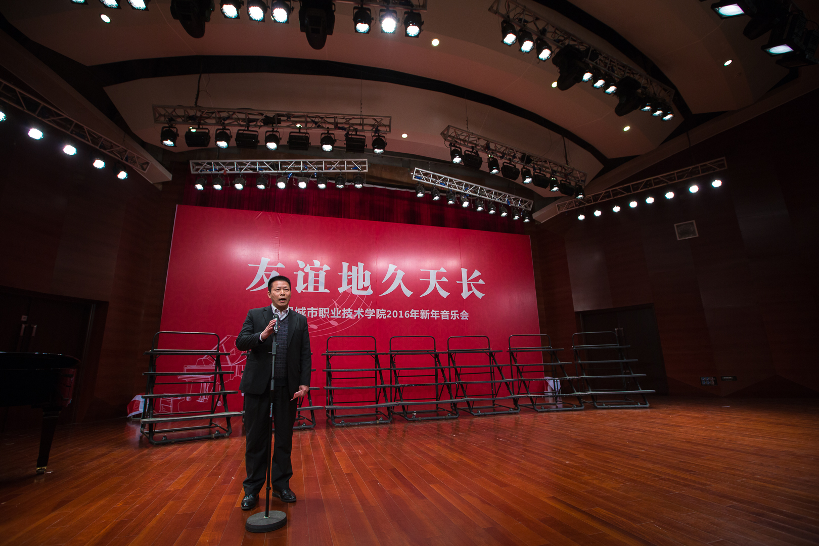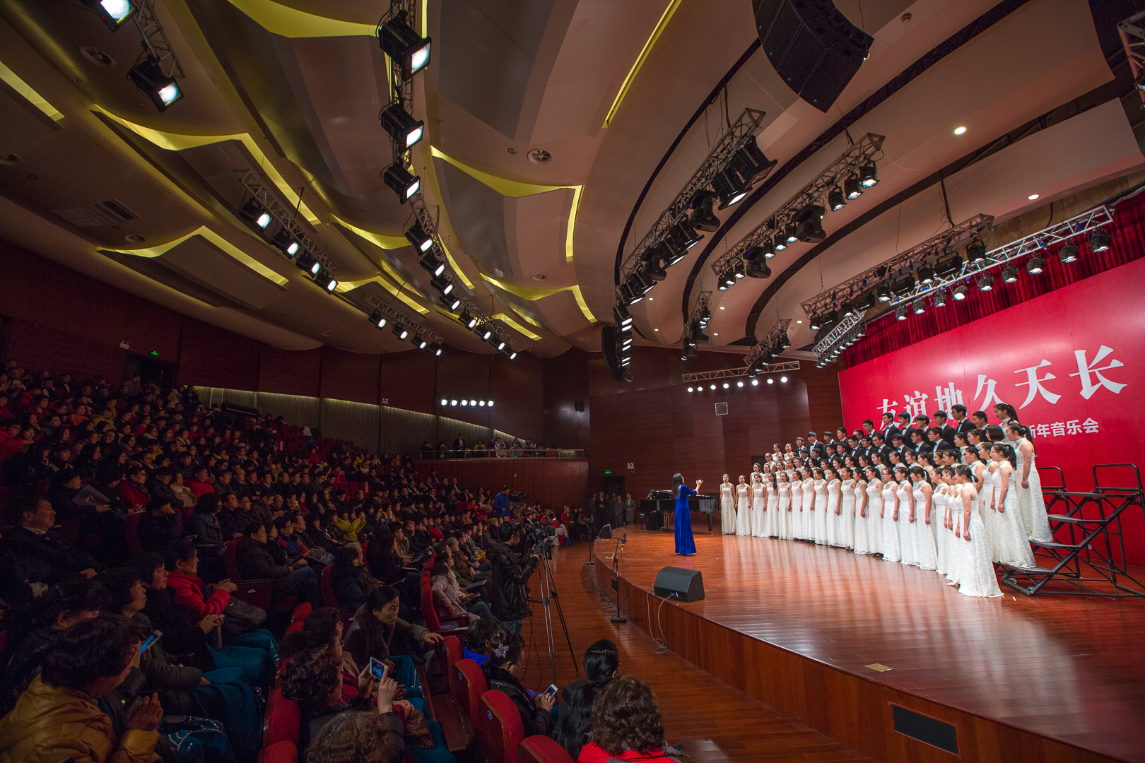 音乐会开始,院党委书记高建宁致词,感谢各合唱团的到来,并为在场观众和全院师生带来两个祝愿:祝愿音乐会给大家带来艺术和美的享受,并取得圆满成功;祝愿大家新年快乐、身体健康、万事如意。