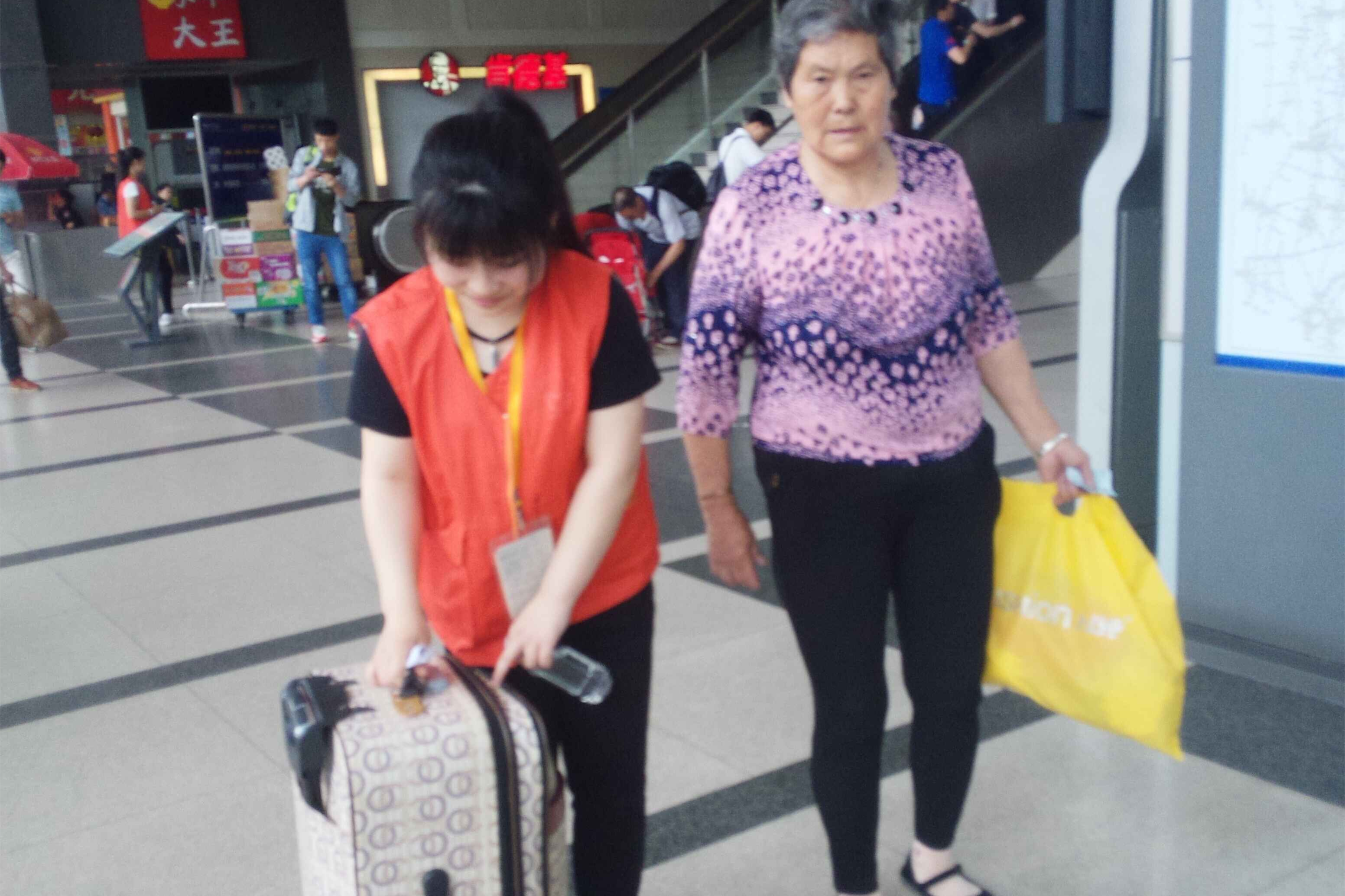 志愿者们在火车站帮助乘客搬运行李