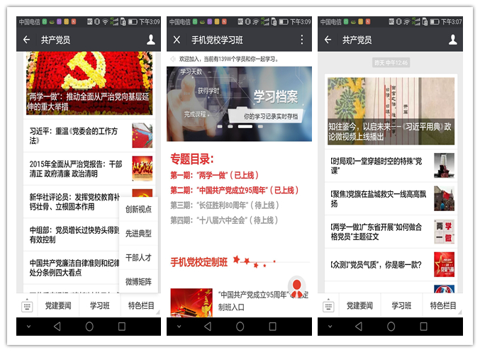 微信公众号由中央组织部党员教育中心主办,围绕党的建设和组织工作,重点推送党建要闻和重要言论、重要工作部署和重要文件解读、热点问题评析等,为全体党员提供了一个党员教育新媒体平台。共产党员微信公众号作为党建教育实践活动的载体之一,发挥党支部微信群“讲党课的小课堂,干群交流的小平台,传播正能量的小窗口,干工作的小助手”作用,促进各种党建活动深入开展。此平台上发布的栏目内容非常有特色,形象直观。对于普通的党员教师来说,订阅“共产党员”微信,能够在第一时间聆听到党的声音;对于学校来说,增加了一个宣传和解读党的政策,促进党建工作的窗口和阵地。