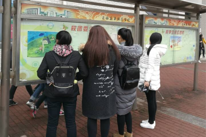 学生观看心理健康宣传栏