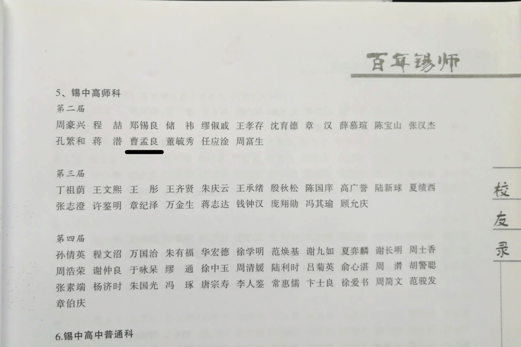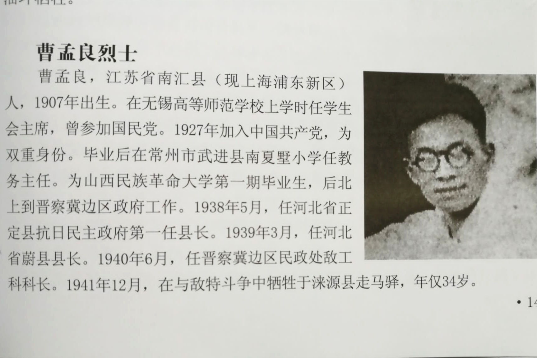 曹孟良,原江苏省南汇县(现上海浦东新区)人,1907年出生,为我校“锡中”时期第二届高师科学生,曾经担任我校学生会主席,在我校校史中有其带领学生“闹学潮”的记录。曹孟良从我校毕业后到常州市武进县南夏墅小学任教务主任,抗战爆发后到山西民族革命大学就读,后北上到晋察冀边区政府工作,1938年5月任河北正定县(习近平总书记83-85年在此任县委书记)抗日民主政府第一任县长,1939年3月任河北蔚县县长,1940年任晋察冀边区民政处敌工科科长,1941年12月在与敌特斗争中牺牲,牺牲后安葬在河北唐县晋察冀烈士陵园。