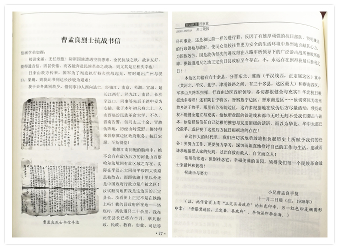曹孟良在正定工作时,还与家里保持着联系,但后来就与家人失去联系,家人一直不知道曹孟良的去向,为了寻找曹孟良的下落,曹孟良的后人也来到我校查找线索但是无果。经过不懈努力,近日曹孟良后代终于找到了烈士的墓碑(具体情况可在网上查找《正定“红色县长”牺牲亲人不知寻半个世纪》一文),让烈士的在天之灵得以告慰。 曹孟良烈士(中) 曹孟良烈士为我校校友 曹孟良烈士书信 |