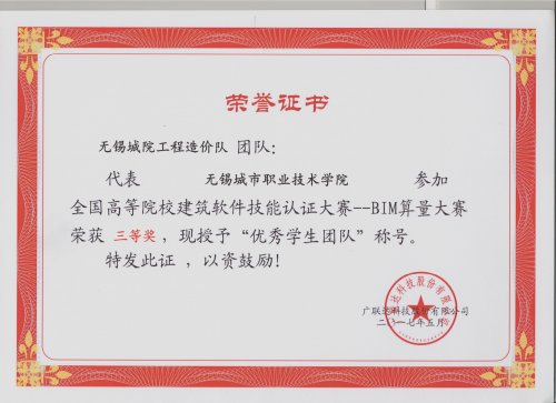 本次BIM算量大赛与我院工程造价专业建筑工程计量与计价、工程造价软件应用等课程教学相对接。行业、企业认证大赛的参与,很好地检验了学生的学习成果,我院相关专业也将通过参与行业认证大赛等活动,激发学生的学习热情,改革课程考核评价方式,创新人才培养模式。 比赛现场 获奖证书 技能鉴定证书 撰稿:孙绮雯 |