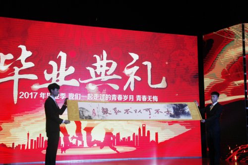 伴着开场视频《城院》,典礼拉开序幕。副院长瞿立新宣读2017届优秀毕业生表彰决定,并为优秀毕业生代表颁发证书。校学生会苏祥同学作为毕业生代表发言,他深情回忆了大学的三年青春,道出了对母校的深深眷恋和殷切祝福。随后,苏祥将印有毕业生手印的“士不可以不弘毅”校训卷轴赠与学院。教师代表袁灿兴将“相信自己,过好自己,保持底线,有所担当”作为离别赠言送给毕业生。