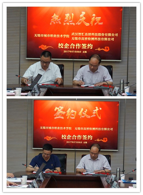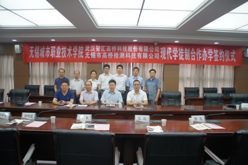 7月6日上午,我院与武汉智汇高桥科技股份有限公司、无锡市高桥检测科技有限公司现代学徒制合作办学签约仪式在学院308会议室举行。院长应可福、副院长瞿立新、发展与规划处处长章永刚、建工学院副院长陈炜、道桥教研室主任陈俊松,武汉智汇高桥科技股份有限公司副总经理张晓东、行政人事部经理陆宪,无锡市高桥检测科技有限公司总经理杨传国、副总经理邵林云等出席签约仪式。