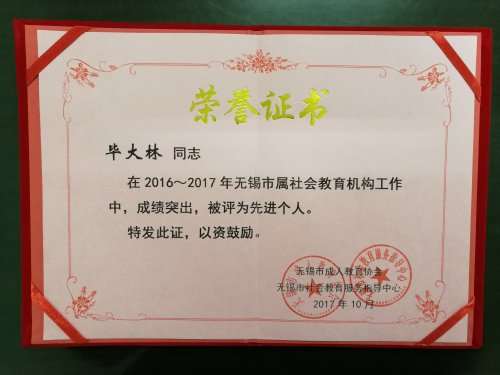 为学习贯彻党的十九大精神,总结交流年度成教工作,表彰近年来成教条线及社区教育(培训)先进单位及先进个人,12月7日,无锡市成人教育协会、无锡市社会教育服务指导中心在无锡科技职业学院召开“2017年全市成人教育总结交流暨表彰会”,大会表彰了经各单位推荐、专家及业务部门评审认定的2016-2017年无锡市属社会教育机构先进单位15个及先进个人15名。我院干部培训与继续教育学院所属社会教育培训机构“无锡市锡师培训中心”荣获先进单位称号,毕大林同志被评为无锡市属社会教育机构先进个人。