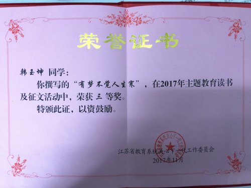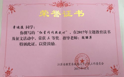 贸易金融学院韩玉坤同学撰写的《有梦不觉人生寒》、师范学院章迪瀛同学撰写的《红星闪闪照我心》在1300多篇征文中脱颖而出,荣获省级三等奖。师范学院陈佳颖同学的作品荣获市级优秀奖。