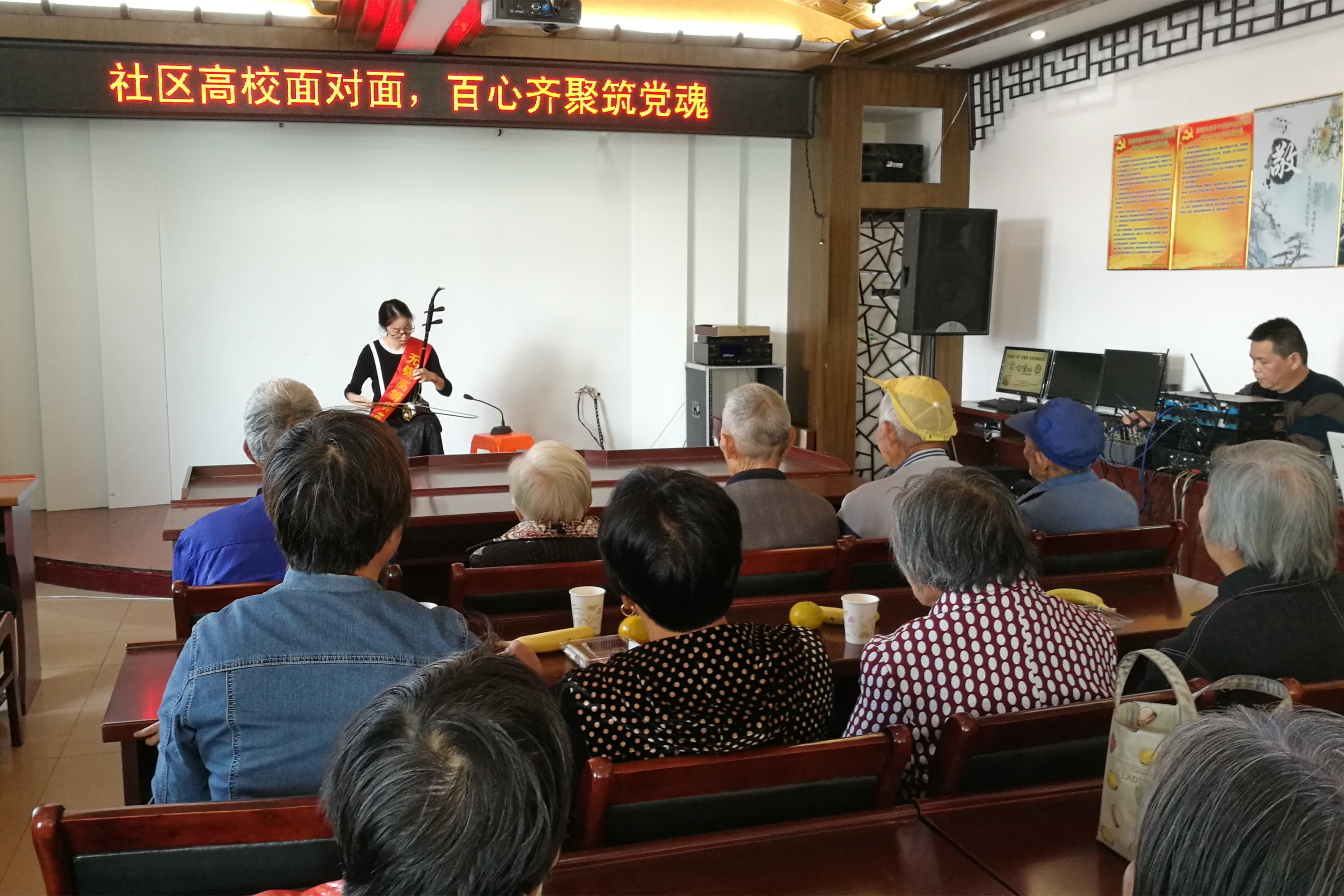 师范学院曾获全国技能大赛乐器组三等奖的殷天瑶同学运用独特的高难演奏技巧,演奏了一曲《万马奔腾》,其精湛的运弓技术形象地表现出骑兵战士守卫边疆的动人场面,让老人们仿佛重回自己青春年少时代。曾应邀赴香港登台演唱、屡次获得省市技能大赛奖项的刘琪钰同学,精选了一曲改编自毛泽东诗词的歌曲《沁园春·雪》,歌曲气势磅礴而又情感深厚,老人们情不自禁地跟着吟唱,现场气氛十分热烈。活动现场,南塘社区的志愿者以及惠山区如意公益协会也表演了戏曲、相声等精彩节目,让老人们乐在其中。
