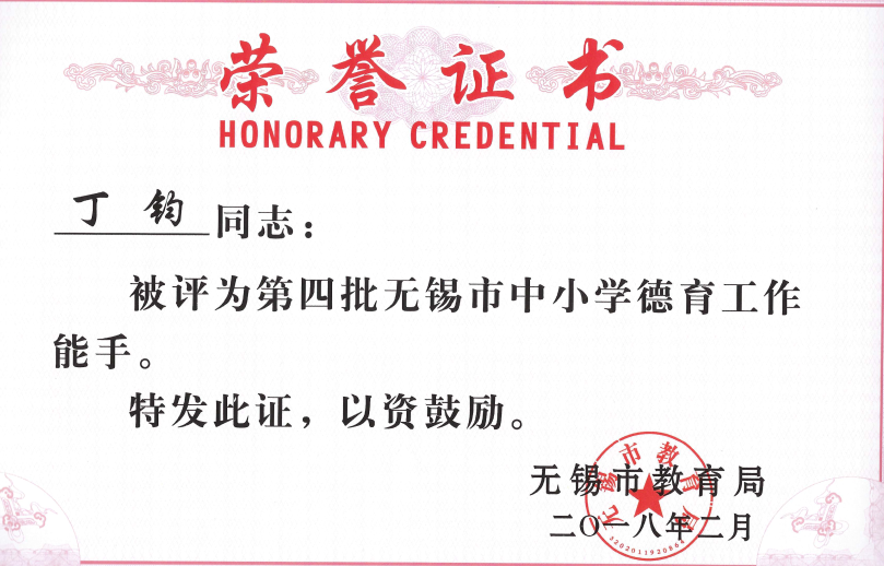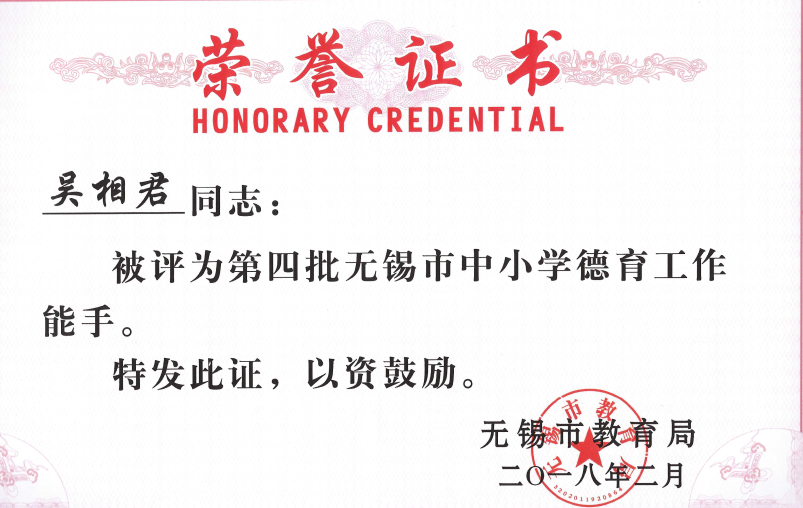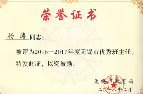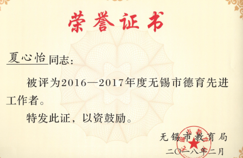 近日,从无锡市教育局传来喜讯,我院师范学院杨涛老师获评2016-2017年度无锡市优秀班主任,学工部副部长夏心怡获评2016-2017年度无锡市德育先进工作者。此外,会计学院吴相君和丁钧两位老师在每三年一轮的无锡市德育工作能手评比中,表现突出,成绩优异,最终获评为第四批无锡市中小学德育工作能手(大市级别)。