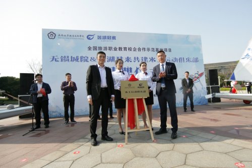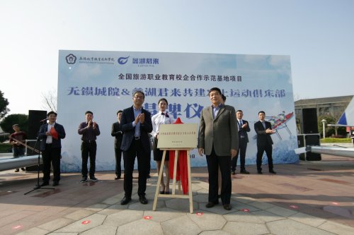 3月28日,无锡城院携手蠡湖君来文化体育发展有限公司共建全国旅游职业教育校企合作示范基地项目——“水上运动俱乐部”揭牌仪式在我院举行。无锡市旅游局副局长柳永红,市体育局副局长汪克强,市文化旅游发展集团党委委员、工会主席王颋,无锡蠡湖君来文化体育发展有限公司董事长杨小飞、总经理陈同海,我院院长张志祥、副院长瞿立新以及无锡市旅游业和体育界代表、我院师生代表共同参加了本次揭牌仪式。