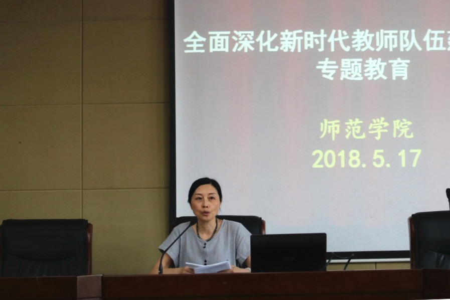 5月17日下午,师范学院组织全体教工于南校区小报告厅举行全面深化新时代教师队伍建设改革的专题教育,主讲人为师范学院王蕾院长。