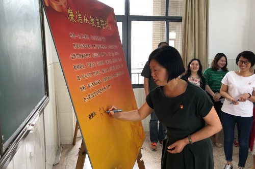 随后,面对鲜红的党旗,全体教师党员紧握右拳宣誓“做学生良师益友,筑教师高尚人格。为祖国培养优秀人才,为人类社会的文明进步而奋斗终生”。宣誓完毕后,全体党员在廉洁从教宣誓板上郑重签上了自己的名字,承诺从思想上和行动上切实做到“做学生满意的教师,办人民满意的教育”。