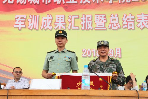 大会上,院长张志祥向承训部队赠送锦旗。党委副书记俞力元宣读了《无锡城市职业技术学院关于表彰2018级新生军事技能训练先进集体和个人的决定》。与会领导分别为获奖的先进集体、学生先进个人代表颁奖。季佳琪教导员代表承训部队在会上作了讲话。