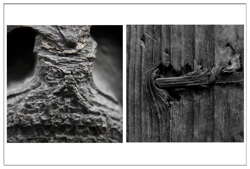 人与自然中存在着各种冲突与和谐,不论大事件还是小细节都存在着,作品《侵入》再现了古建筑木构件中的细节,由人为的结构冲突,经过几百年后和谐相处,成为另一种相融的状态。