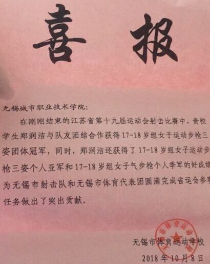 在刚刚结束的江苏省第十九届运动会射击比赛中,我院旅游学院郑润洁同学以决赛448.3环获得U18女子三种姿势个人亚军、以决赛226.5环获得U18女子气步枪个人季军,为学院赢得了荣誉。她领衔的无锡队还获得U18女子运动步枪三种姿势团体冠军、U18气步枪混合团体季军,为无锡市体育代表队完成省运会比赛任务做出了积极贡献。郑润洁同学(右二)上台领奖郑润洁同学获得多枚奖牌