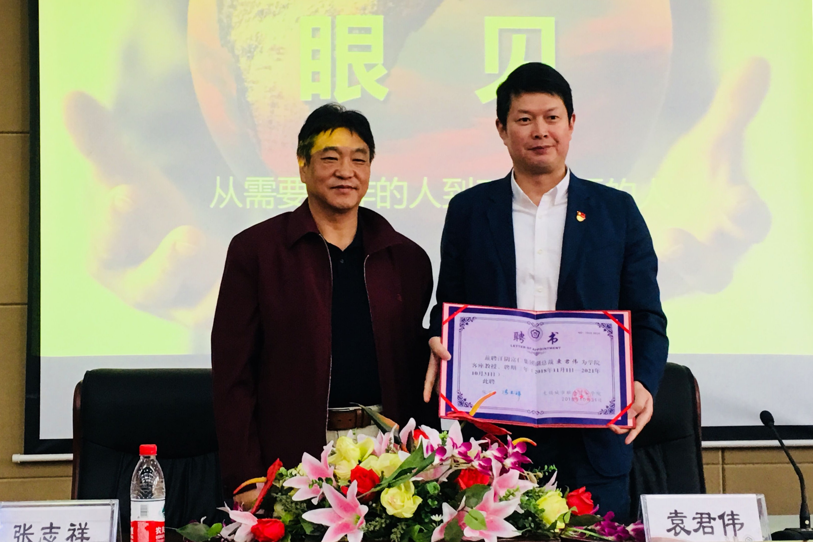 随后,袁君伟教授作了题为《眼见——从需要工作的人到工作需要的人》的专题讲座。他提到,作为新时代的大学生要首先看清所处时代的发展趋势,然后发自内心地了解自己和认识自己,要保持谦虚的姿态,学会做人生的选择并付诸行动。袁教授的讲座内容紧扣大学生的所思所想,语言诙谐又不失内涵,内容“潮”味十足却发人深省。讲座结束后,很多同学表示讲座内容直击心灵,受益匪浅。(撰稿:彭容容) 张志祥院长为袁君伟颁发客座教授聘书 |