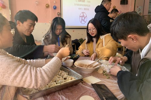同学们按照分工各负其责、各显其能。大家边包边聊,其乐融融,笑声不断。活动中,还增加了有奖问答等游戏环节。包完饺子,大家不忘新年送温暖,给宿舍楼管阿姨、教学楼护工阿姨端去了热腾腾的饺子。