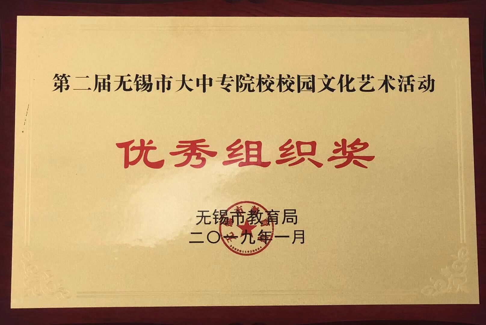近日,从无锡市教育局获悉,我校师生在第二届无锡市大中专院校校园文化艺术活动中取得佳绩。我校选送作品及节目在朗诵、辩论、歌唱三大类比赛中在累计获得各类奖项3项,其中配乐朗诵二等奖,高校辩论赛第三名,歌手大赛三等奖。另有3名教师获得优秀指导教师奖。因成绩显著,我校荣获“优秀组织奖”。