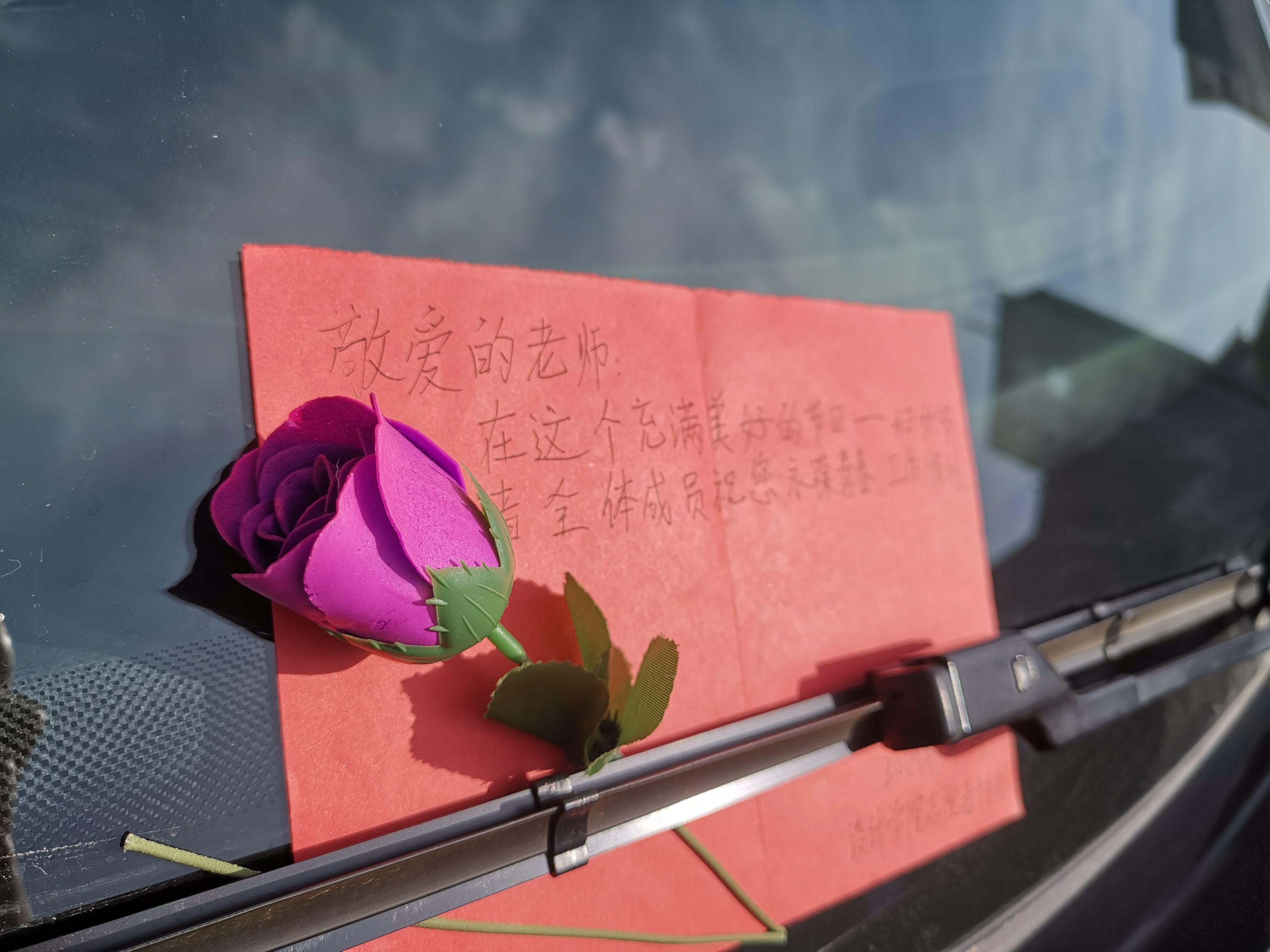 上午九点,志愿者准时在食堂广场集合,活动开始,他们迅速分工,用抹布认真细致地擦拭车身每一个角落,忙得热火朝天。经过近一个小时的清洗,一辆辆“崭新”的车在早春的阳光中熠熠生辉。洗车结束后,同学们还在车窗上悄悄留下了手工制作的祝福卡片与玫瑰。志愿者说,老师一天工作下来很辛苦,希望今天的志愿服务,能给她们的通勤路途带来一缕美好心情。