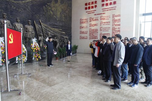 全体党员在机关党总支书记沈国裕的带领下,于革命先烈的雕塑群像前敬献了花圈,并面对庄严的党旗,重温了入党誓词。