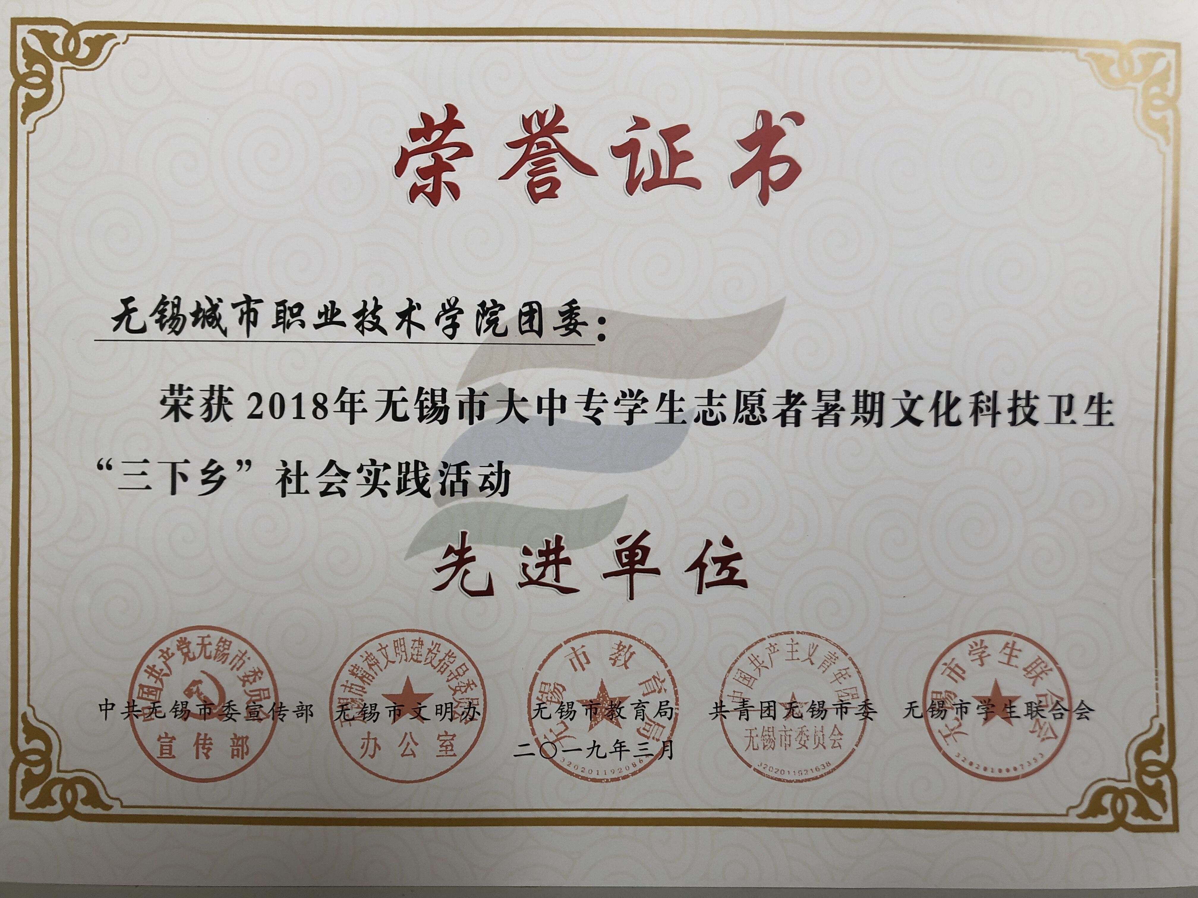 近日,中共无锡市委宣传部、市委文明办、市教育局、团市委、市学联等单位联合表彰2018年无锡市大中专学生志愿者暑期文化科技卫生“三下乡”社会实践活动先进集体和个人,我校共计17项集体(个人)获得表彰,其中集体类表彰9项。