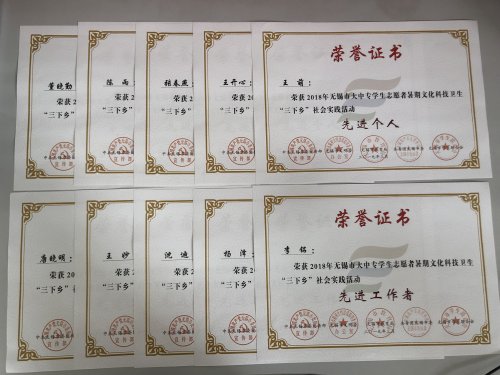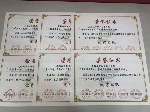 我校获评“2018年无锡大中专学生志愿者暑期文化科技卫生‘三下乡’社会实践活动先进单位”;“爱心传递,点亮公益”关爱云南山区留守儿童教育关爱服务团等6支实践团队获评“2018年无锡市大中专学生志愿者暑期‘三下乡’社会实践活动优秀团队”称号;李铭等5位老师获评“2018年无锡市大中专学生志愿者暑期‘三下乡’社会实践活动先进工作者”称号;张春燕等5名同学获评“2018年无锡市大中专学生志愿者暑期