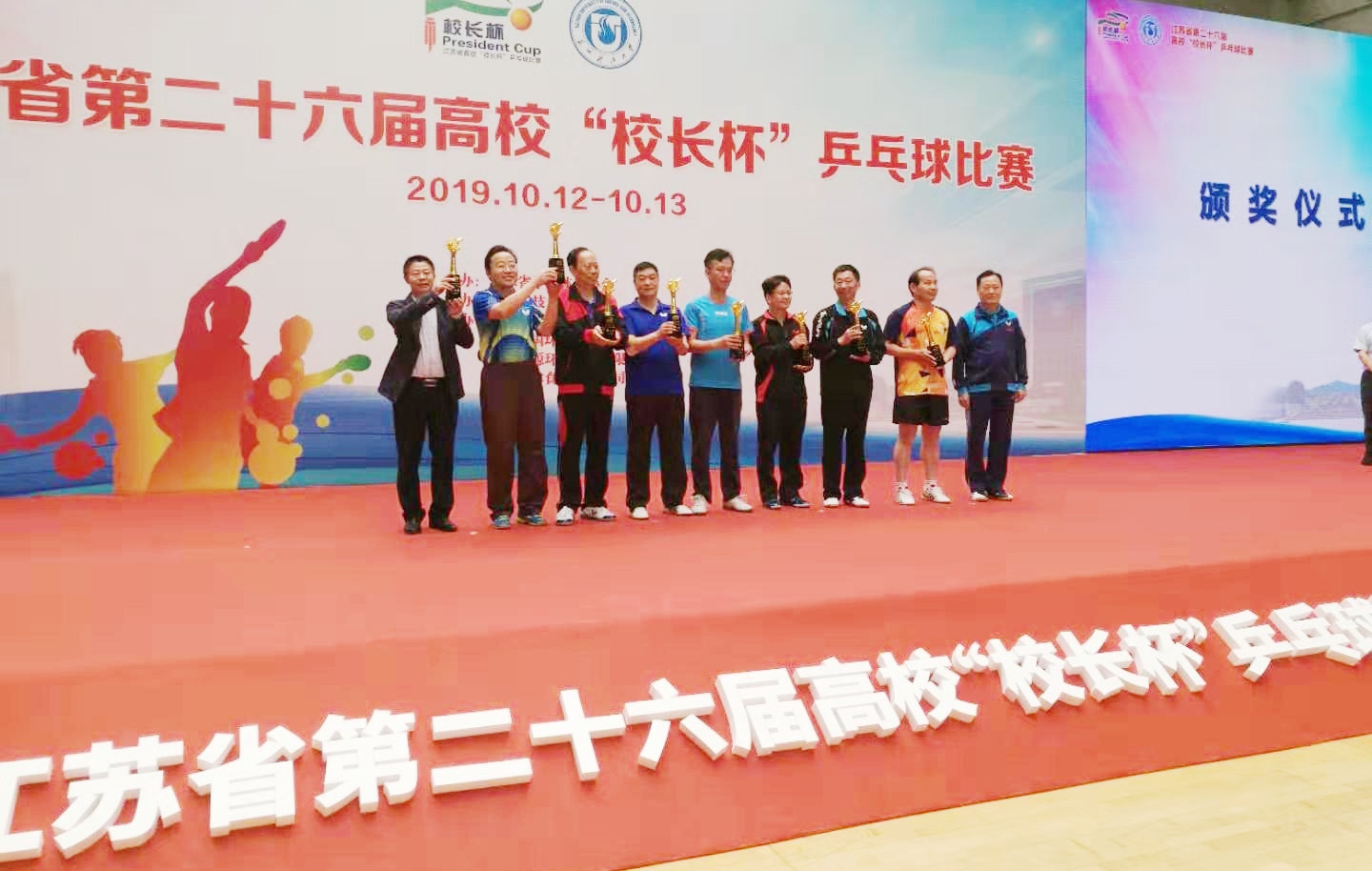 10月12日-13日,江苏省第二十六届“校长杯”乒乓球比赛在苏州科技大学体育馆举行,来自全省高校和教育行政部门的113支队伍参加了本次比赛。我校以党委书记应可福为领队,校长张志祥、副校长王远东、纪委书记刘永平、工会主席陈新为运动员的乒乓球队,经过小组赛以及淘汰赛,勇夺高职组冠军,刘永平以全胜战绩获得“优秀运动员”称号,这是我校历届比赛取得的最好成绩。 省第二十六届高校“校长杯”乒乓球赛在苏州科技大学举行 校长张志祥代表学校领奖