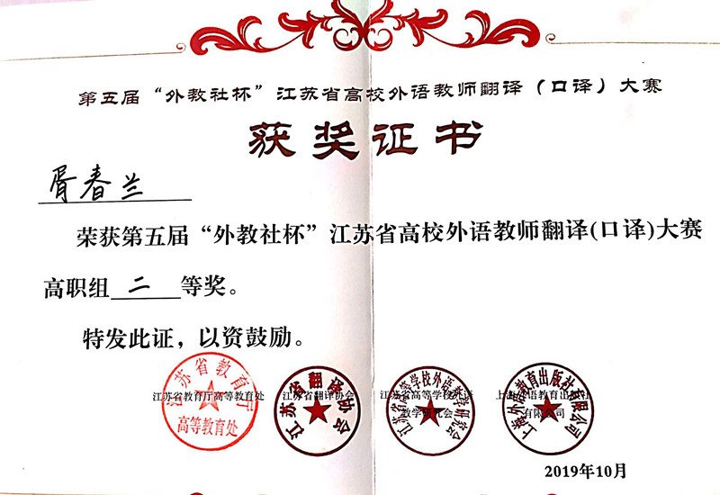 10月18日至19日,第五届“外教社杯”江苏省高校翻译(口译)大赛在江苏海洋大学苍梧校区举行。来自省内高校的40名选手经过“英译汉”人机对话环节的复赛阶段竞争,最终高职和本科院校共计14名选手进入决赛。决赛试题以“亚洲文明交流互鉴”为主题,要求选手“汉译英”。我校基础课部胥春兰老师认真准备、沉着应战、发挥稳定,最终荣获高职组二等奖,并被外教社推荐加入江苏省翻译协会。省教育厅高教处、省高等学校外国语教学研究会、省翻译协会、江苏海洋大学等单位领导出席颁奖典礼并为获奖选手颁奖。