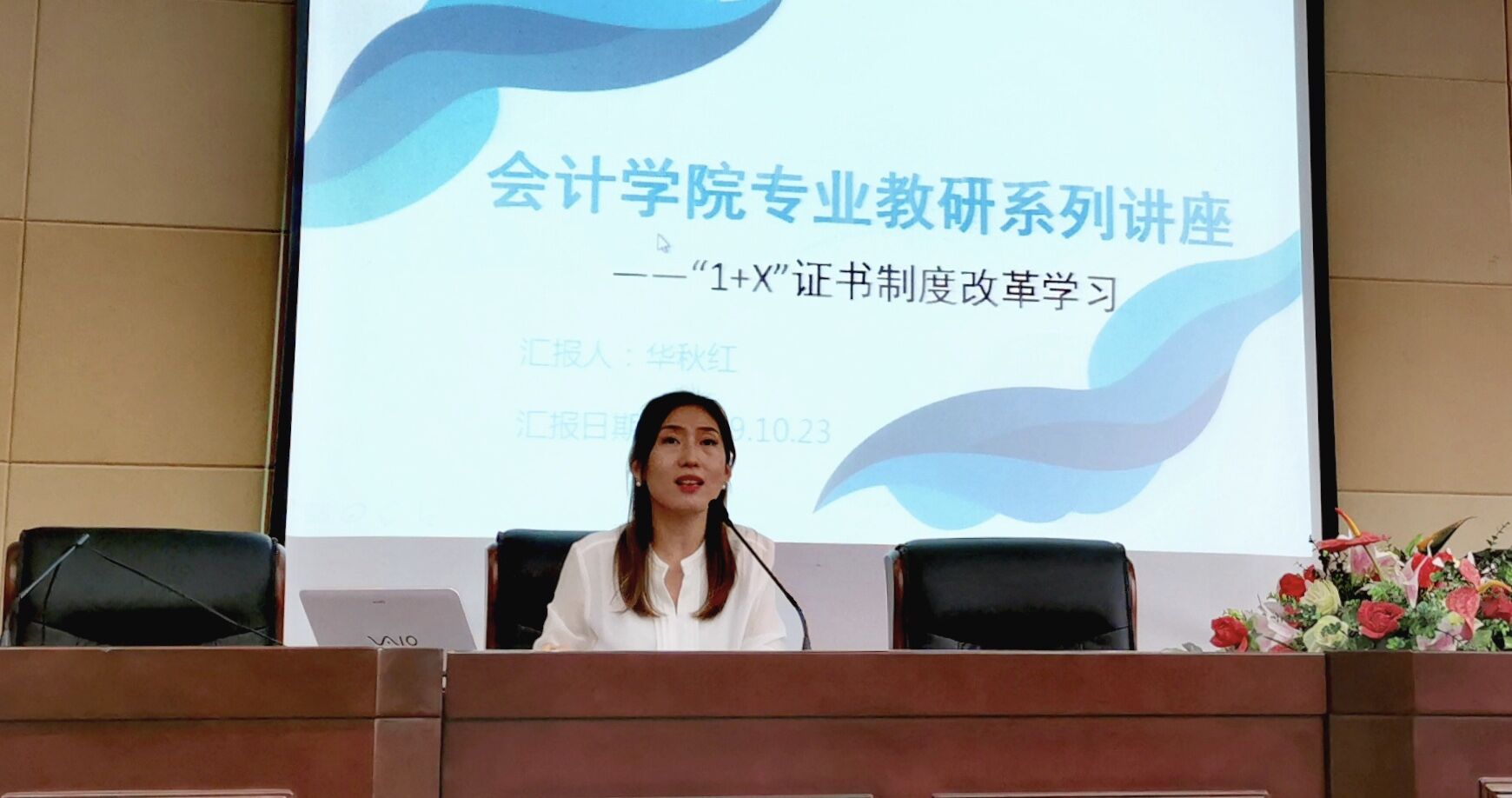 10月23日下午,会计学院在南校区小报告厅开展了一场以“1+X”证书制度改革学习为主题的专业教研系列讲座,会计系主任华秋红主讲,全体教师参加了讲座。