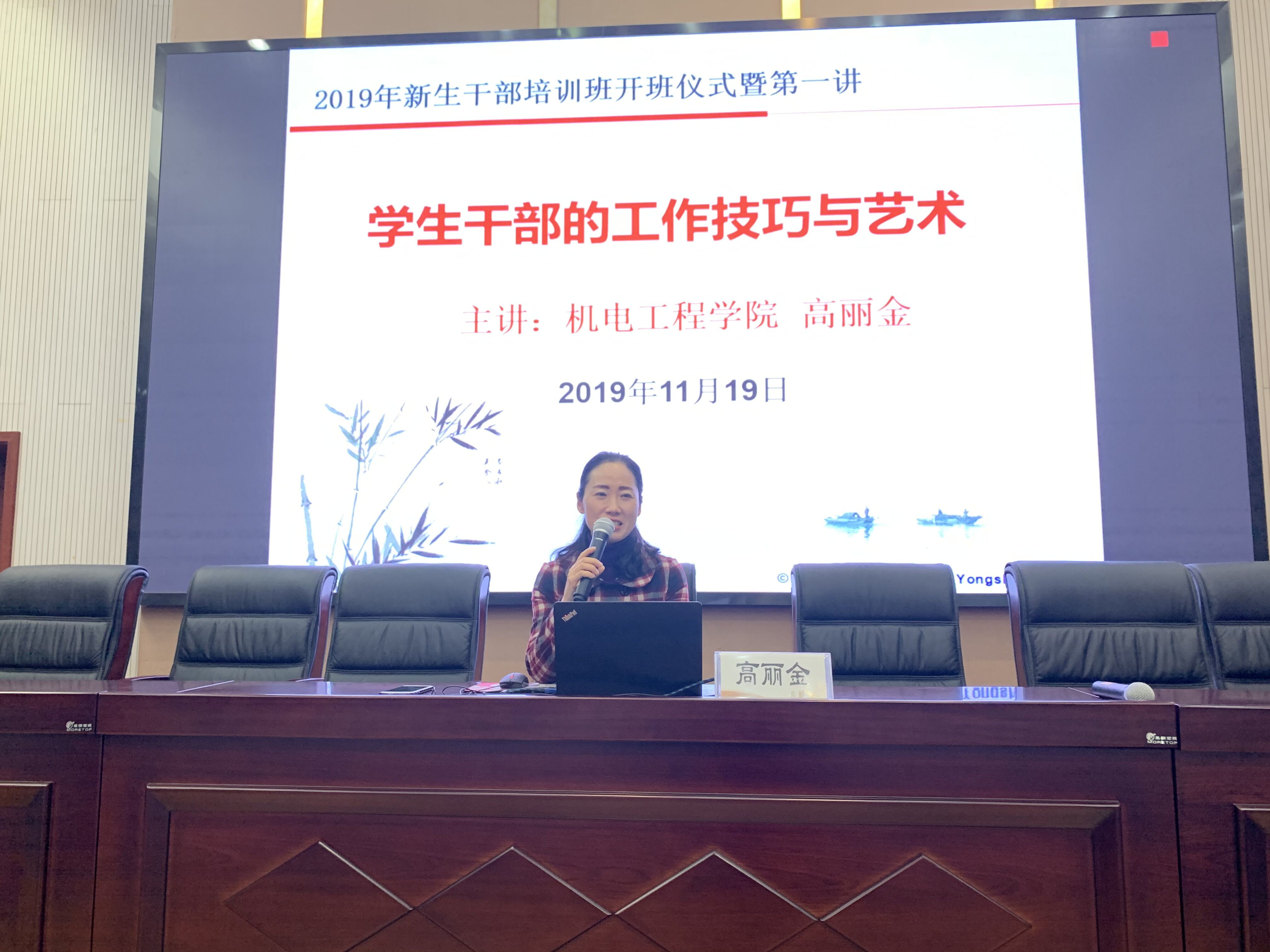 仪式结束后,高丽金为学员开设了《学生干部工作的方法与艺术》主题讲座,她从自己的学生时代讲起,结合事例就学生干部应该具备的多项素养逐一展开,并对参训学干提出几点希望。一是带头学理论、强信念、讲政治、严自律、改作风、守规矩,把学生干部的好形象树立起来;二是努力提高工作能力,不断提高学习力、执行力、行动力;三是能“代表广大青年、赢得广大青年、依靠广大青年”,不断开创各项工作新局面。