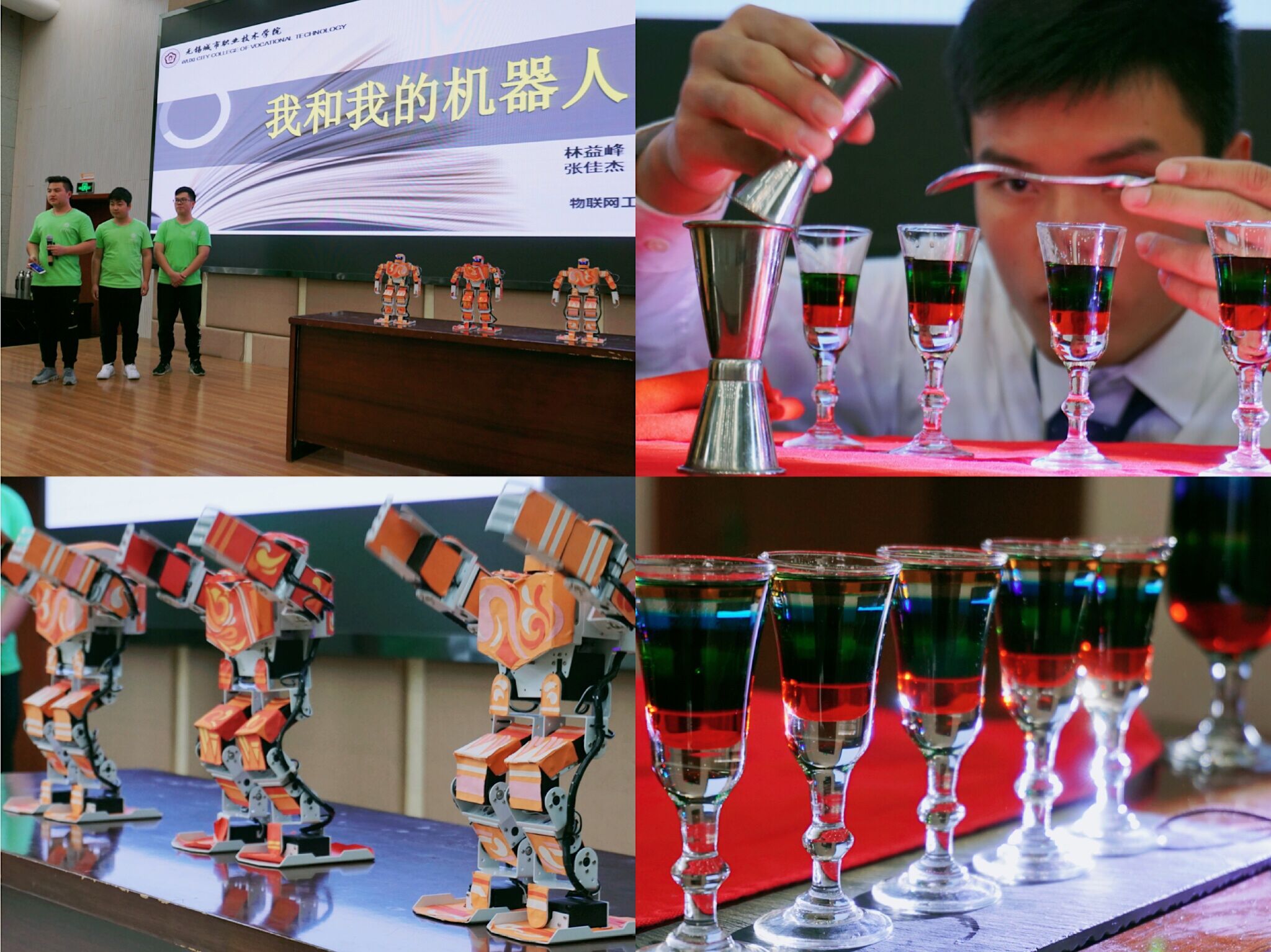闭幕式最后,“真人图书荟”及“微朗读”部分获奖项目和作品进行了现场精彩分享和展示。其中,旅游学院张镇等三位同学组成的团队,在为师生展示的同时讲解了莫吉托、彩虹酒和龙舌兰日出等鸡尾酒的调制方法和他们背后的文化内涵,并将阅读和调酒巧妙结合,从中体悟到人生的酸甜苦辣。物联网工程学院的林益峰等四位同学组成的团队,展示了他们在江苏省大学生机器人大赛中获得一等奖的作品机器人舞蹈《敦煌》,并以“我和我的机器人”为题,分享了比赛期间克服各种困难、求知奋进的故事,鼓励同学们在校期间一定要找到准确的目标,不浪费青春年华。