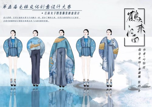 ,以江南之水为灵感源泉,取水天一色之湛蓝,塑造出诗情画意中的富庶,有情有意之江南服装设计作品。银奖作品《锡城里的新拾光》将传统无锡的地方建筑为设计来源,设计具有城市特色的笔记本系列。
