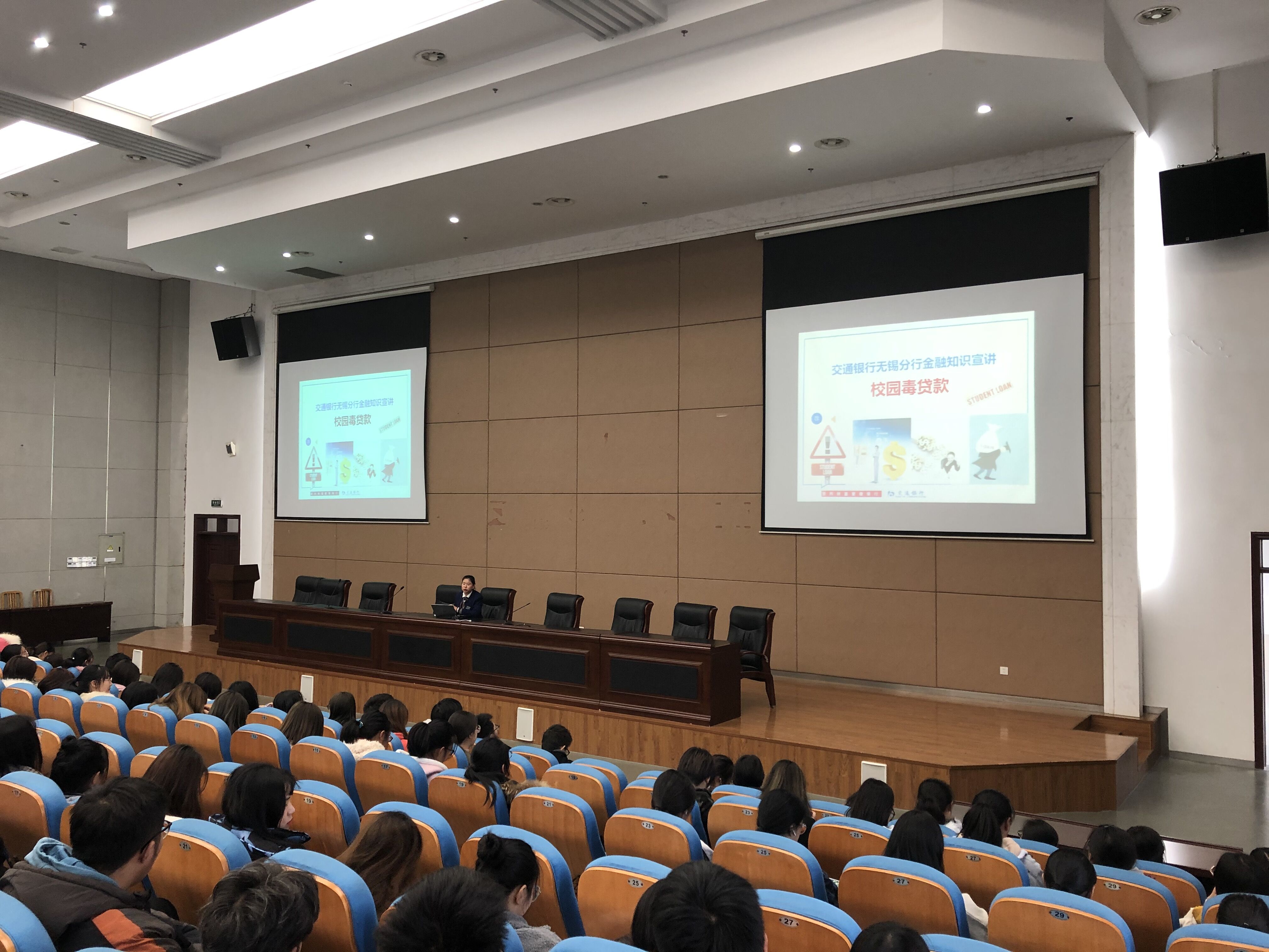 12月11日下午,会计学院在南校区大报告厅举办了“如何防范校园毒贷款”的金融安全知识讲座,特邀无锡智慧党建联盟单位交通银行无锡分行的专业宣讲员钱经理为主讲嘉宾,19级全体学生参加本次讲座。