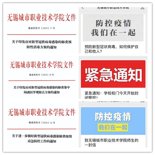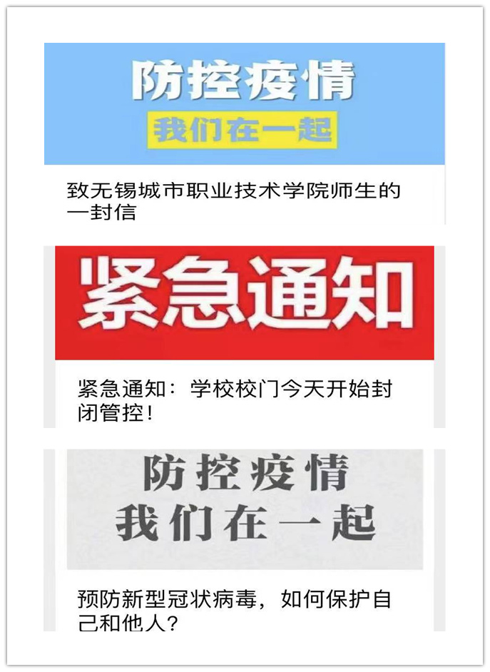 加强防控宣传教育。学校疫情防控工作领导小组通过微信公众号、微信群、QQ群等渠道持续开展新型冠状病毒感染的肺炎的防控宣传教育,发布“致无锡城市职业技术学院各级党组织和全体共产党员的一封信”“致无锡城市职业技术学院师生的一封信”“致无锡城市职业技术学院全体辅导员、班主任的一封信”,向师生宣传普及新型肺炎传播途径、症状和防范知识和措施,引导广大师生以科学的方式防范疫情;提醒师生不提前返校,不参加各类聚集性活动,避免引发疫情扩散;提醒师生理性判断各类网络信息,做到不恐慌、不信谣、不传谣,以平和的心态面对疫情,传递抗击疫情的正能量;号召全体师生员工、党员干部齐心协力、群防群控,切实做好疫情防控工作。