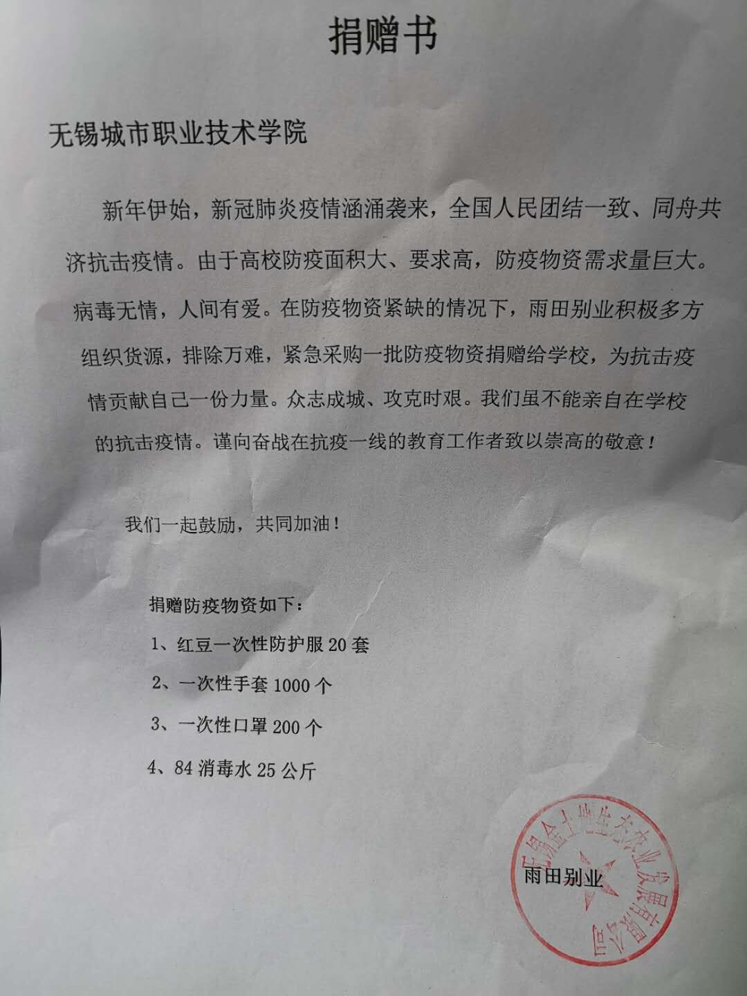 无锡金土地生态农业发展有限公司(梅亚萍名师工作室实践基地-雨田别业)捐赠一次性防护服20套、一次性手套1000只、一次性口罩200只、84消毒水25公斤;南京方通科技公司捐赠一次性口罩2000只、84消毒液10桶、医用手套1000只、消毒喷雾器10台、红外体温枪5支、洗手液4桶。爱心企业的捐赠对我校疫情防控工作是及时有力的支持。 捐赠现场