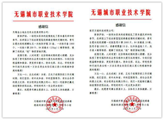 梅亚萍代表学校向此次捐赠的两家爱心企业的善行义举表示衷心的感谢,向关心、支持我校疫情防控工作的各界朋友表达崇高的敬意。她表示,疫情无情,人间有爱;防控攻坚,八方支援。自我校疫情防控战打响以来,从教职工到企业都在积极行动,加班加点奋战一线、踊跃参与捐献物资,为抗击疫情贡献了力量、汇聚了暖流。我校将切实管好用好所捐物资,严格物资使用,让物资真正用在刀刃上,发挥最大的效益。 致爱心企业感谢信 |