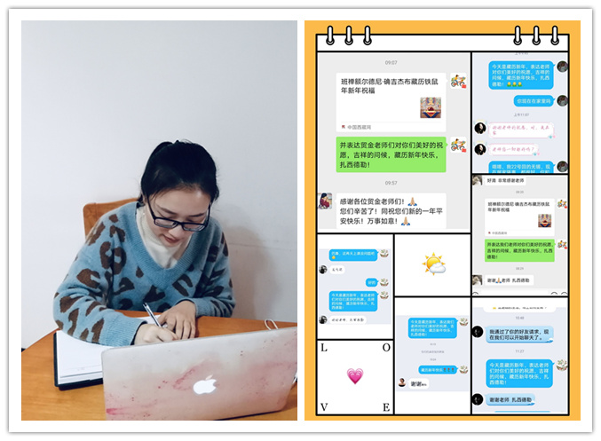 物联网学工团队对904名在籍学生全面排查,每日打卡;普及防范知识,在线进行思想引导和心理疏导;督促完成在线课程;通过“团聚物联”、“WL物联部落”微信公众号发布主题作品和先进典型,弘扬正能量;认真细致的工作带给师生以温暖,还收到学生们的感谢,计网1801班藏族学生格桑多杰制作小视频送来藏历新年祝福,物联网学工团队将同舟战疫,共盼春风。