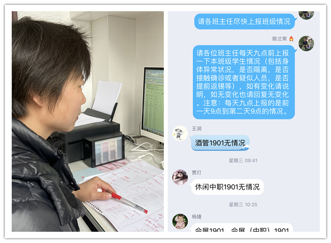 新型冠状病毒疫情当前,辅导员、班主任和广大学子团结一心,凝聚力量,一同面对此次疫情,以最快速度应答,以最细考量部署,以勇姿态冲锋。学工老师们作为连接学生和学校的桥梁,更是坚守一线,担当起了全覆盖、无死角进行防控工作的重要使命。老师们使用不同的方法与同学们联系,用自己的方式将温暖传送到每个人身边。