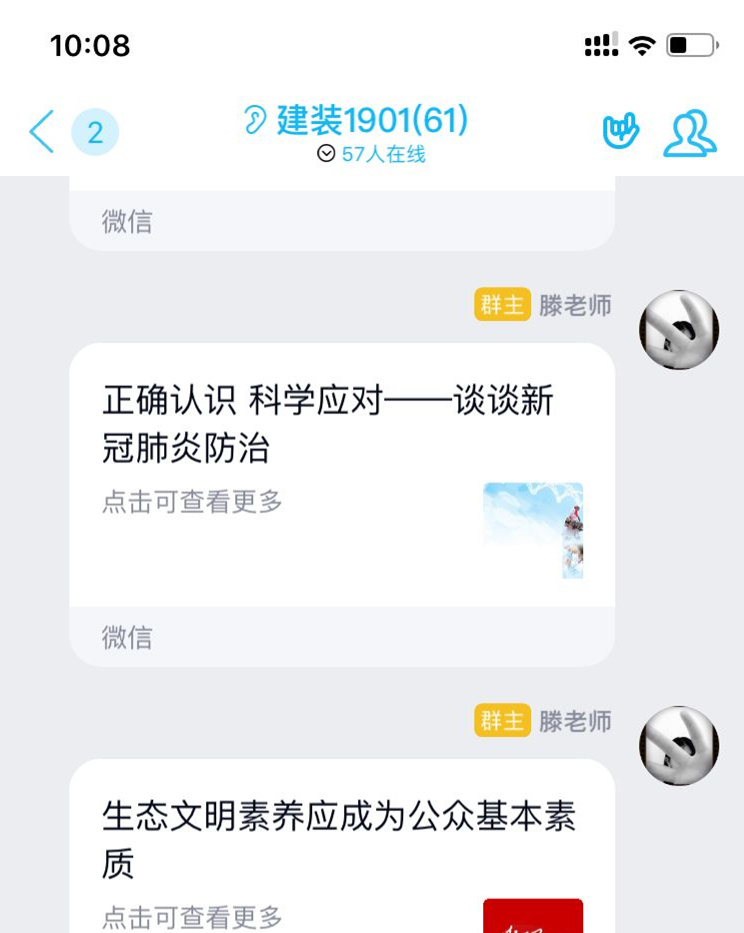 建环学院开展大学生思想政治教育,通过转发推送疫情防控过程中以习近平同志为核心的党中央对全国全面部署教育引导学生更加拥护党的领导、维护党的领导核心;通过转发推送疫情防控过程中的中国速度、中国力量、中国之治向学生们深刻讲解疫情防控中中国特色社会主义制度的巨大优势彰显;通过转发推送一批又一批的最美“逆行者”向学生们深刻讲解疫情防控中践行使命担当与责任坚守;通过转发推送疫情防控过程中需要大家严格遵守和积极配合执行疫情防控的规定和措施教育引导青年学生要尊法守法、提升文明素质。