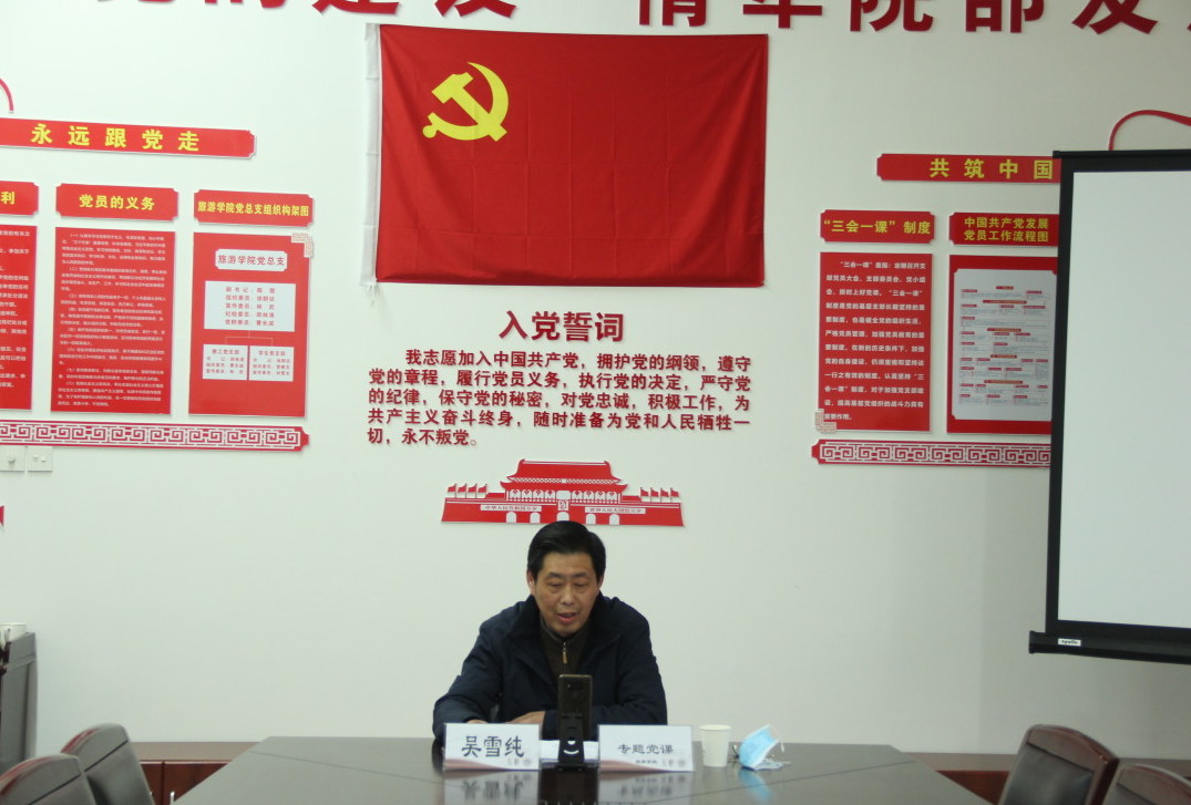 3月13日,在防控新冠肺炎疫情的非常时期,根据学校党委组织部相关要求,旅游学院党总支在学习强国APP上以视频会议的形式,在线上开展了一次特殊的线上主题党日活动,副校长吴雪纯以“使命担当共克时艰”为主题给旅游学院全体师生党员上了一堂生动精彩的专题党课。会议由旅游学院党总支副书记徐群征主持。