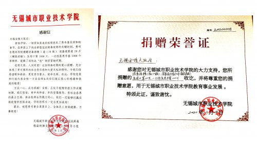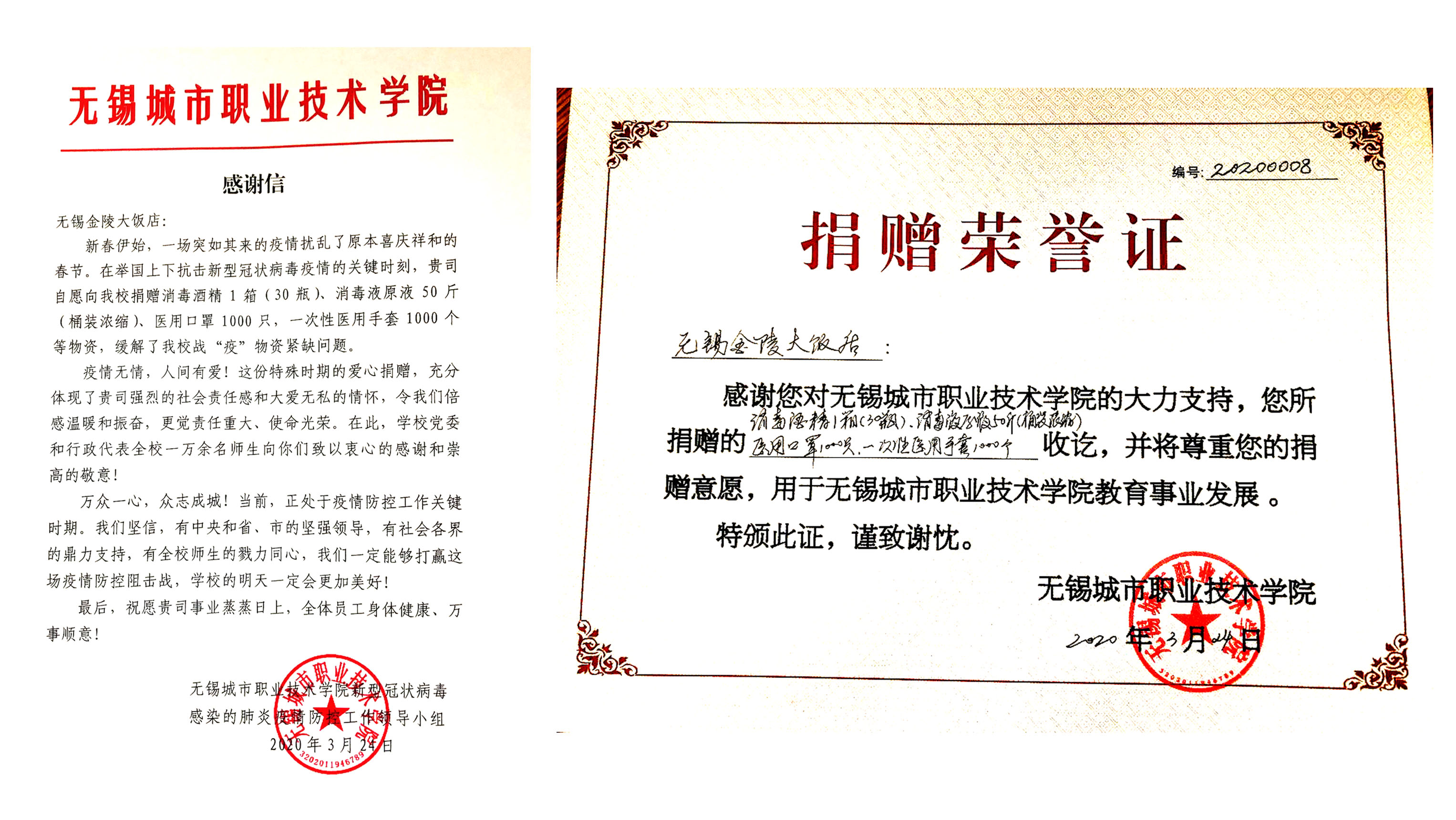 无锡金陵大饭店向学校捐赠消毒酒精1箱、消毒原液50斤、医用口罩1000只、一次性医用手套1000副等物资,对我校的疫情防控工作提供了有力支持。