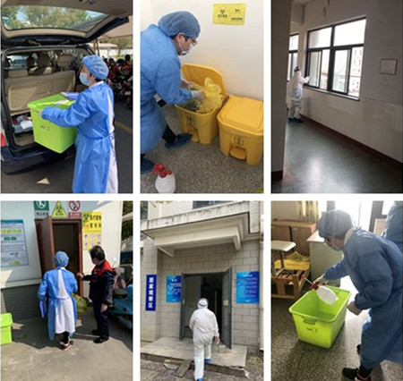 “环境消杀组”由物业职工组成,负责观察区公共区域每天卫生保洁、消毒、生活垃圾清运及医疗垃圾协助处理工作。每天用含有效氯500mg/L的消毒液对隔离观察点内环境进行消杀,确保隔离点的环境安全。