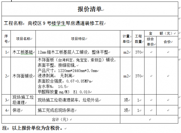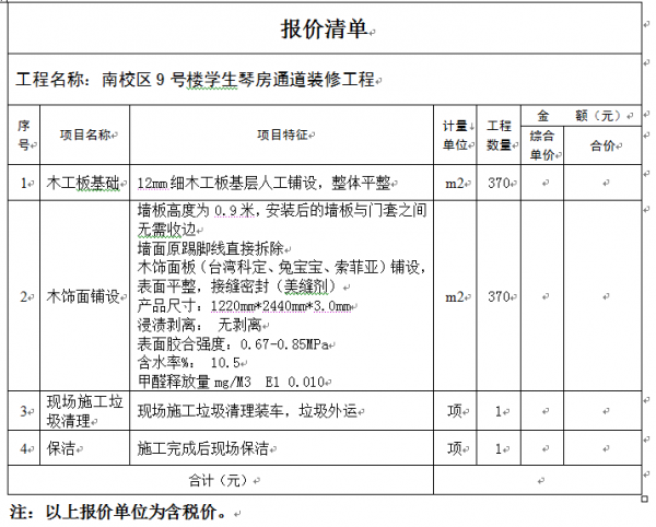 无锡城市职业技术学院南校区9号楼学生琴房通道装修工程项目进行零星项目采购招标,已于2020年4月3日在无锡城市职业技术学院网站上发布了招标公告,现发布更正公告。 原公告日期:2020年4月3日 经现场勘查后答疑汇总,由多方综合论证后作出以下更正调整。 更正事项及内容: 2.原报价清单文件中表格: 调整为: 如采购文件中涉及到以上修改的部分,其具体要求视同做相应修改。 无锡城市职业技术学院