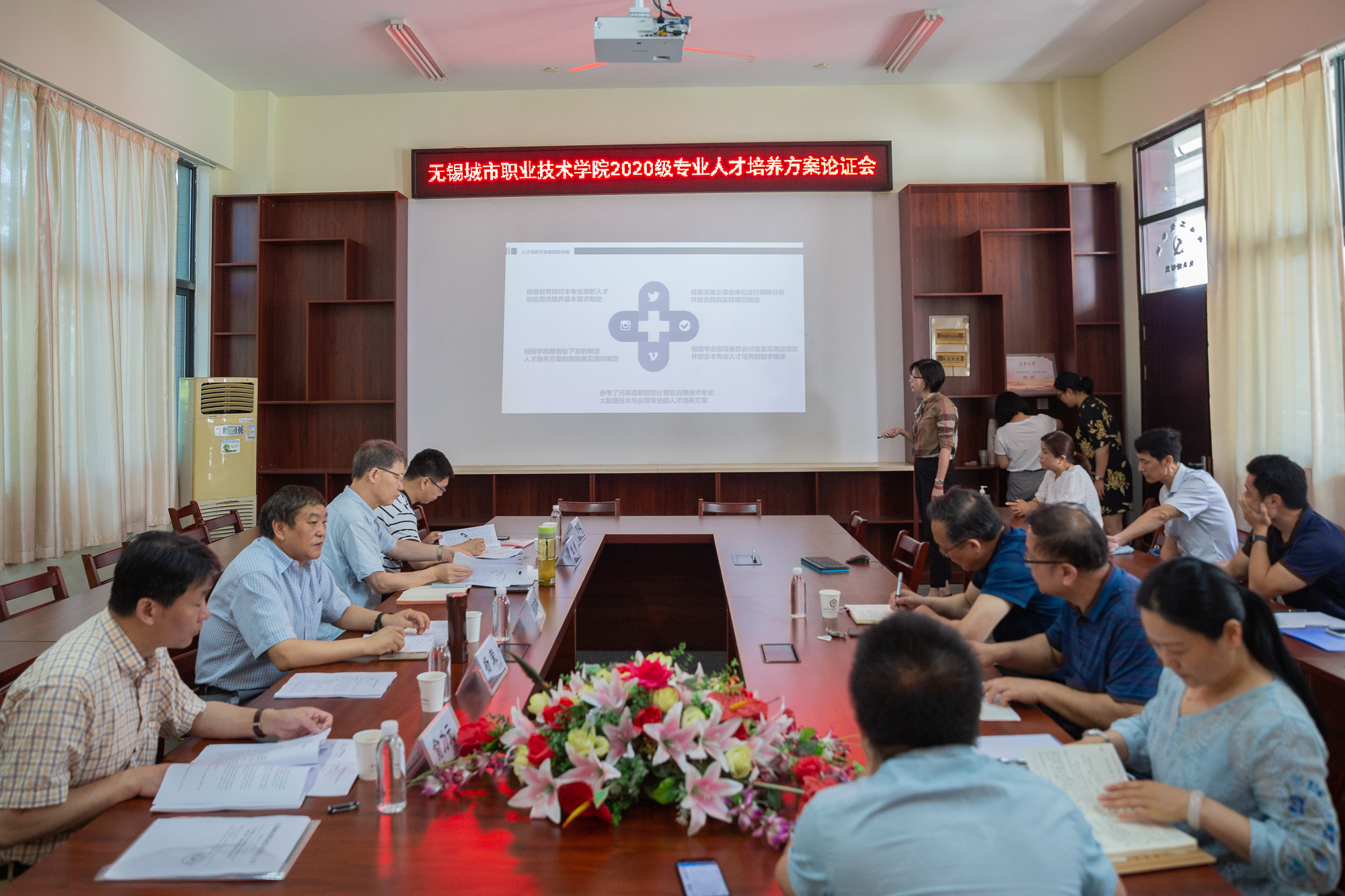 会上,首先对学校专业建设指导委员会委员颁发了聘书。然后,论证专家分为三组,分别在北校区行政楼308会议室、教学楼1206会议室、教学楼2204会议室,听取了二级学院2020级各专业人才培养方案制(修)订的思路定位、规范落实、课程设置、实践环节、特色及亮点等方面的PPT汇报后,从专业定位、岗位面向、课程设置、能力育成等方面对全校49个2020级专业人才培养方案(不含招生类型)进行了逐项论证,指出了不足与努力方向。