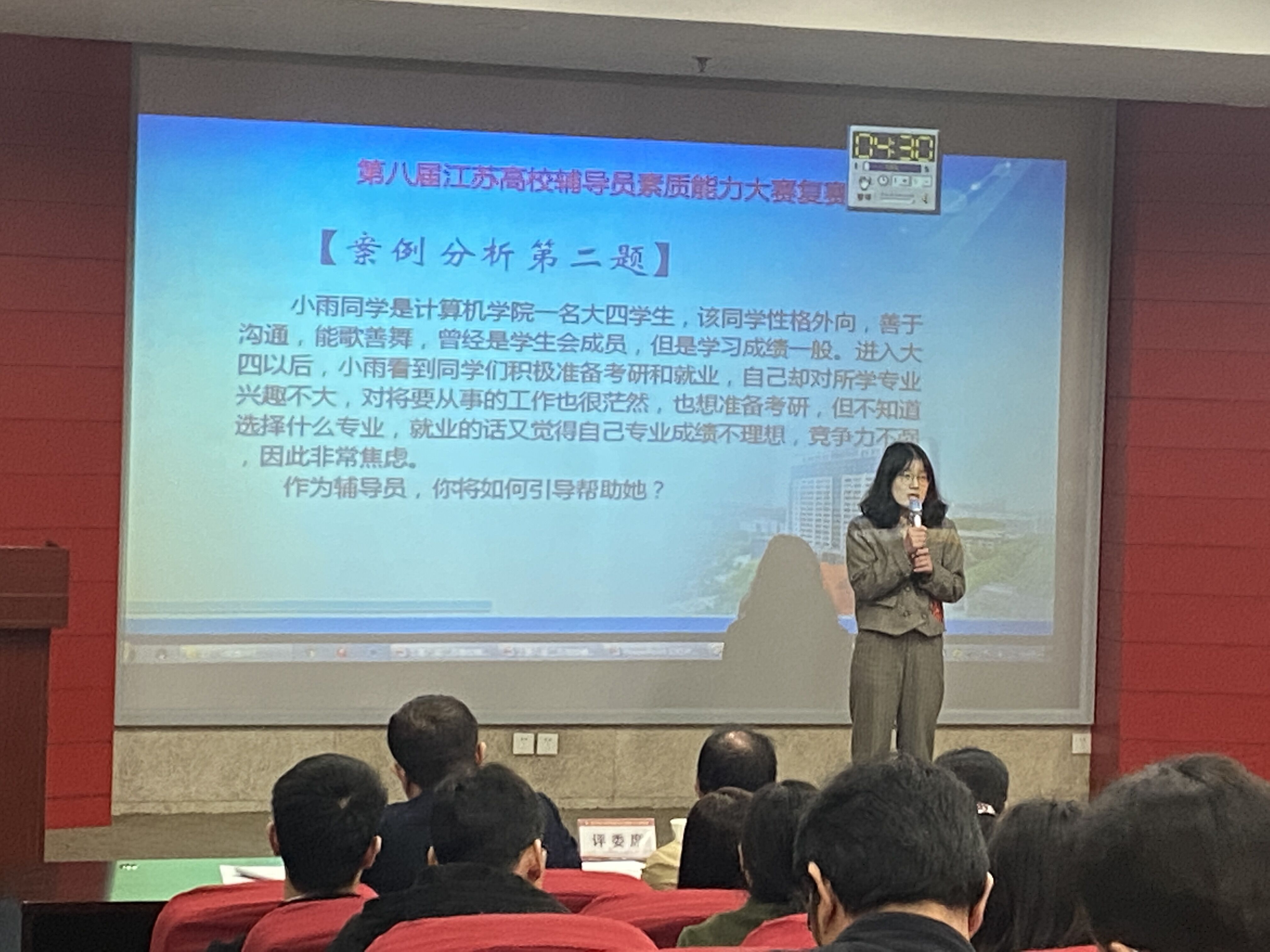 本次比赛共有来自镇江、常州、无锡三市18所高职院校的辅导员参加。比赛分为笔试、案例分析、谈心谈话和理论宣讲四个环节,对参赛选手的理论水平、专业素养以及解决实际问题的能力进行了多角度的考察。陈皖在赛场上临危不惧,沉着应对,充分展示了我校辅导员良好的职业素养和精神风貌。