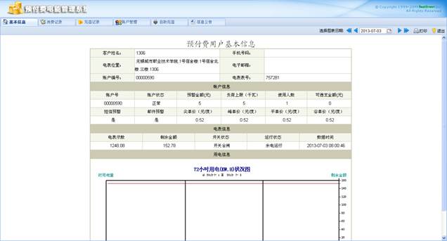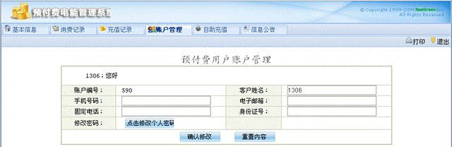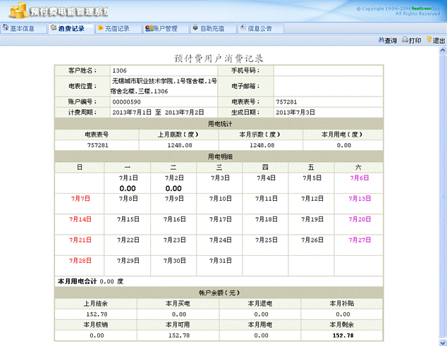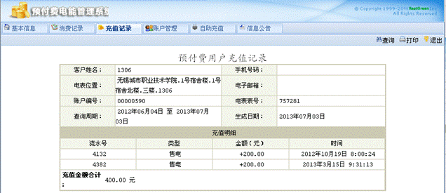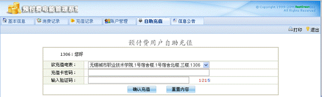 学生登录无锡城市学院预付费服务中心网页:http://101.76.40.10/(图1) 图1 选择房间号(注:因学号未导入,因此只能使用房间号查询,默认密码888888)根据页面提示,层层找到自己的房间号码(图2): 图2 输入密码,点击【登陆】按钮(图3): 图3 进入房间“预付费用户基本信息”页面(图4): 图4 这里可以查看房间预付费电表的基本信息及72小时内用电情况。 在预付费电能管理系统页面顶部,有“基本信息”、“消费记录”、“充值记录”、“账户管理”、“自助充值”、“信息公告”几项选单,点击每个选项都可以进入相应的管理页面,可以对本宿舍的预付费电表信息进行更多的查询或管理操作,如下图(图4)所示: 消费记录: 图5 充值记录: 图6 账户管理:这里可以修改本宿舍登录系统的密码 图7 自助充值:购买充值卡后,刮开充值卡密封区可显示密码,按照页面提示输入密码及验证码,点击【确认充值】按钮完成充值操作 图8 |