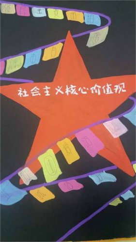 用一颗红色五角星代表国家的繁荣昌盛,围绕在五角星周围的彩旗展示着社会主义核心价值观24字内容,充分体现了社会主义核心价值观的主题